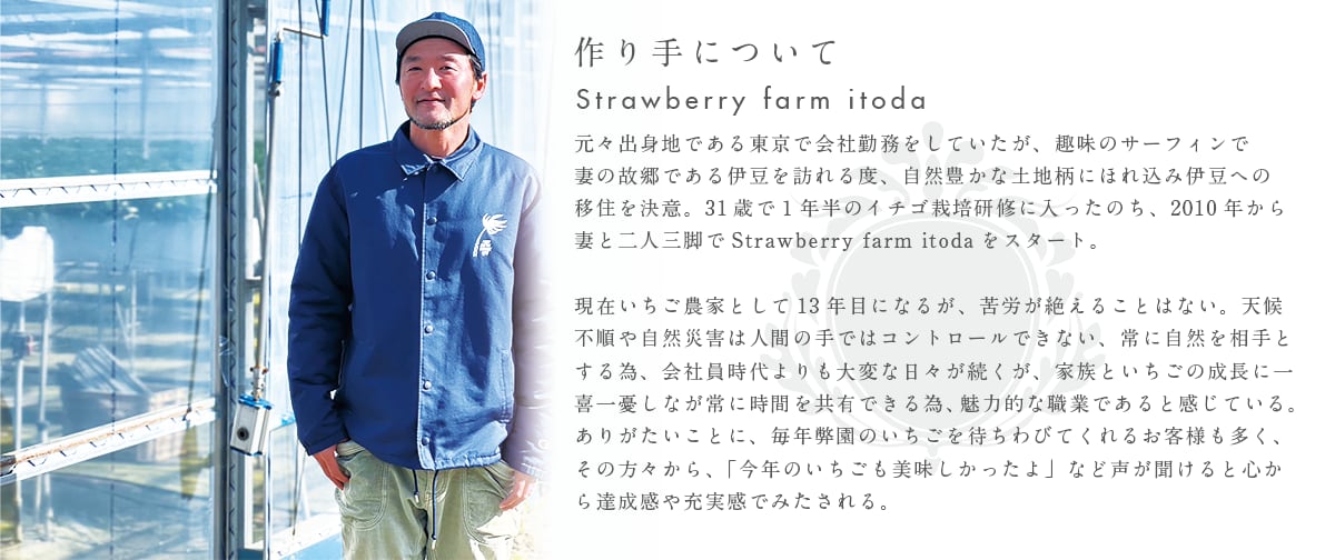 イチゴは収穫時の完熟度が味に大きく影響し、甘さも香りも際立ちます。南伊豆のイチゴ栽培に適した環境で、芳醇な摘み立てのイチゴは格別です。ただし傷みが早いので、輸送が難しい所、今回はイチゴ農園さんに無理を言って、摘みたてのイチゴを直送できる体制構築をお願いいたしました。